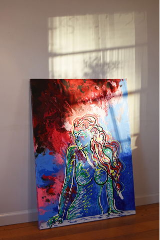 Katerina Huezo’s work unfolds across five distinct series, each offering a different lens on her core themes of emotion, myth, and connection. Rays captures the pulse of the night city through architectural forms and neon light. Emotions turns female silhouettes into living embodiments of feeling. Universe travels outward into cosmic resin landscapes that glow in the dark. Flow experiments with watercolors and ink to reveal soft, feminine figures in motion. And Connecting returns to nature with floral and animal silhouettes rendered in rich mixed media. Together these series form an evolving archive of her artistic journey.