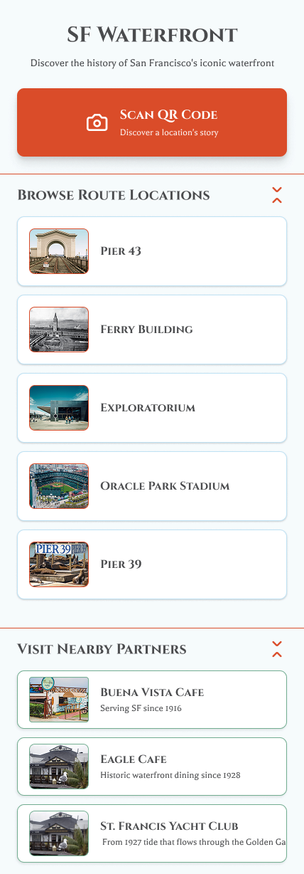 Great technology needs a vessel that makes people want to use it. This San Francisco iteration wraps the LLM in maritime-inspired UI—Cinzel headers echoing ferry terminal signage, soft blues reflecting bay water, vintage typography honoring the city's printed history. But aesthetics serve strategy: every interaction pattern (swipeable timelines, era toggles, location-based unlocks) is designed for walking tourists who need delight, not friction. The interface adapts to context—a museum visitor gets different pacing than a street explorer. This SF theme is one skin; the underlying UX framework translates to any city's visual identity. Tokyo gets neon and clean modernism. Florence gets Renaissance warmth. The agent provides the intelligence; the interface provides the invitation. Together, they create something people photograph, share, and remember.